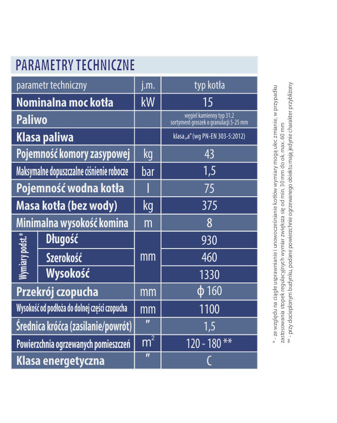 Kocioł MZN blue o mocy 15 kW to wysoko efektywne urządzenie grzewcze wykorzystujące proces dolnego spalania. Innowacyjna budowa w postaci rurowo – pułkowego wymiennika ciepła, a także poprzez zastosowanie paneli ceramicznych z odpowiednimi dopływami powietrza w komorze spalania, sprawia że kocioł posiada wysoką sprawność i stałopalność. Trzon kotła wykonany jest ze stali gatunkowej kotłowej ( P265GH) o grubości 6 mm. Proces dolnego spalania charakteryzuje się niską emisją zanieczyszczeń, dokładnym dopaleniem paliwa, a także niższą temperaturą spalin. Kocioł ten posiada ruszta wodne wykonane z wysokogatunkowej stali, pochylone pod specjalnym kątem co umożliwia dokładne dopalenie paliwa oraz ruszta ruchome, co pozwala na oczyszczanie paleniska z popiołu. Kocioł MZN spełnia restrykcyjne wymagania ekoprojektu (ecodesign) określone Rozporządzeniem Komisji (UE) 2015/1189 z dnia 28 kwietnia 2015r. w sprawie wykonania dyrektywy Parlamentu Europejskiego i Rady 2009/125/WE w odniesieniu do wymogów dotyczących ekoprojektu dla kotłów na paliwa stałe. Klasa energetyczna: C. Zestaw wspomagajacy ciag kominowy - Sterownik ST28. Wentylator wyciagowy